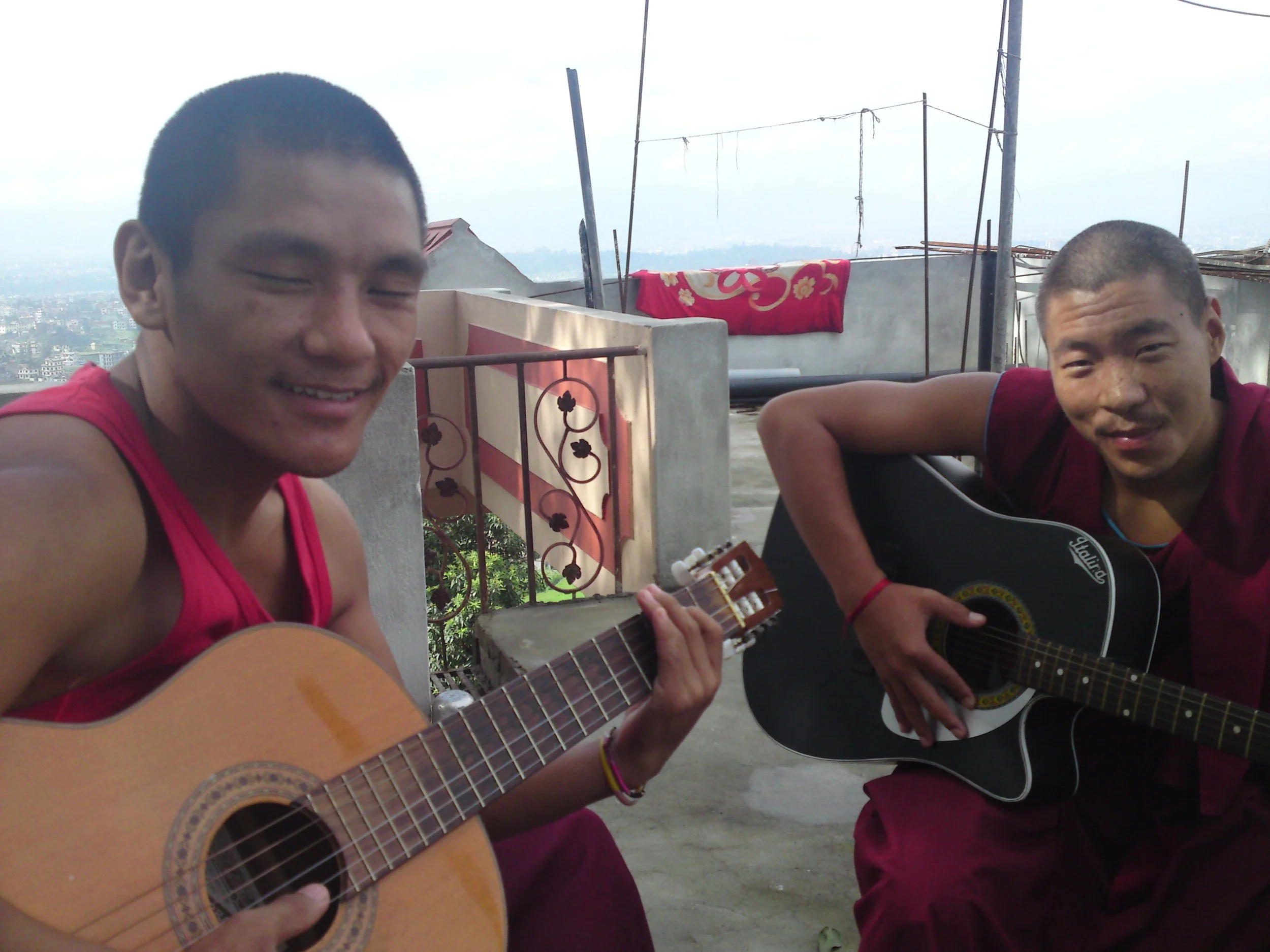 Buddhist monks enjoying a guitar lesson in Kathmandu, Nepal