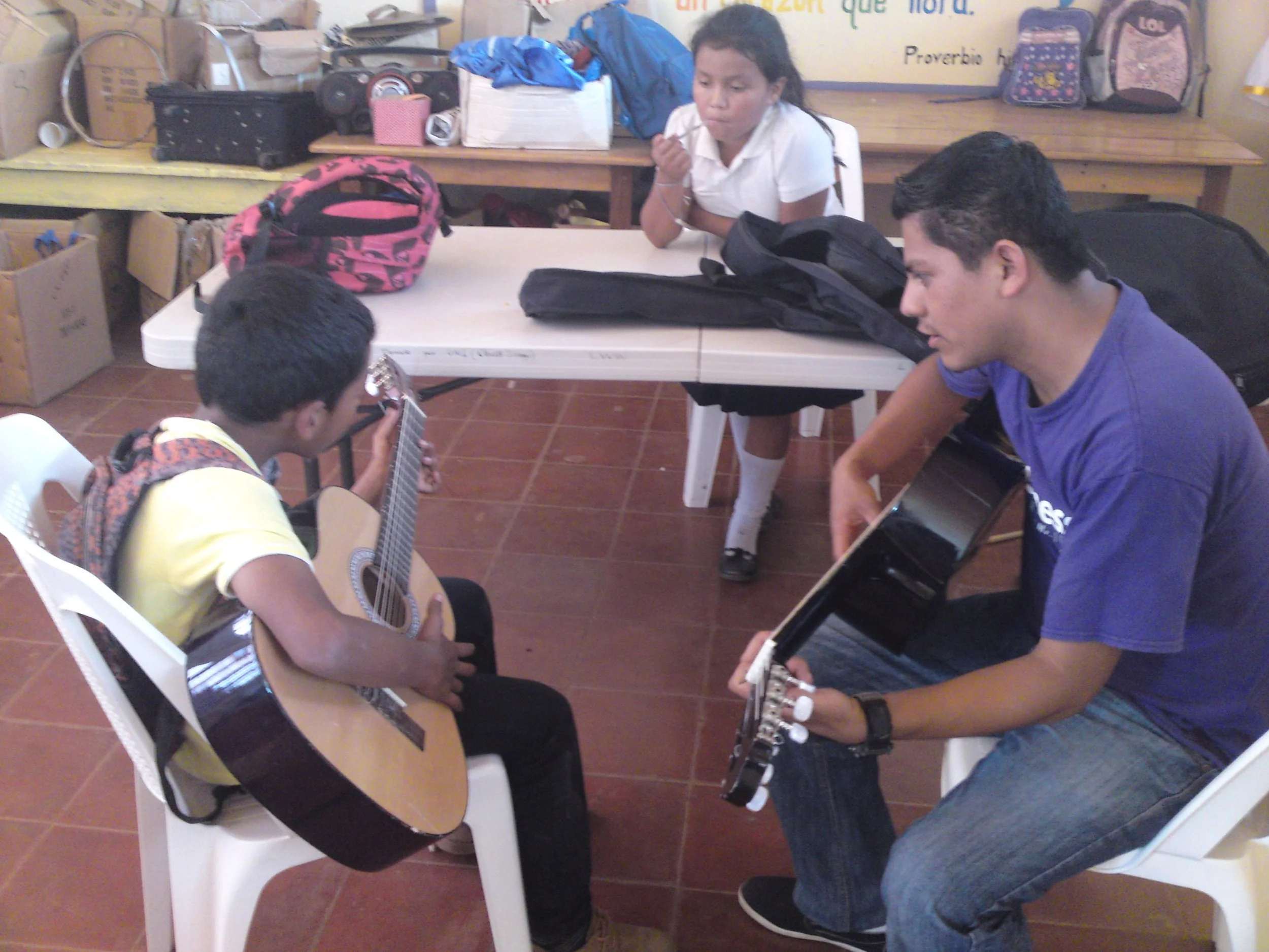 Adept Guitarist teaching his new student with their new guitars at a school in Matagalpa, Nicaragua